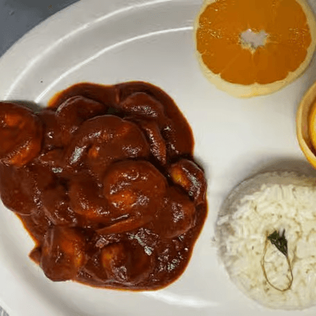 Spicy shrimp in salsa roja, served with white rice & beans