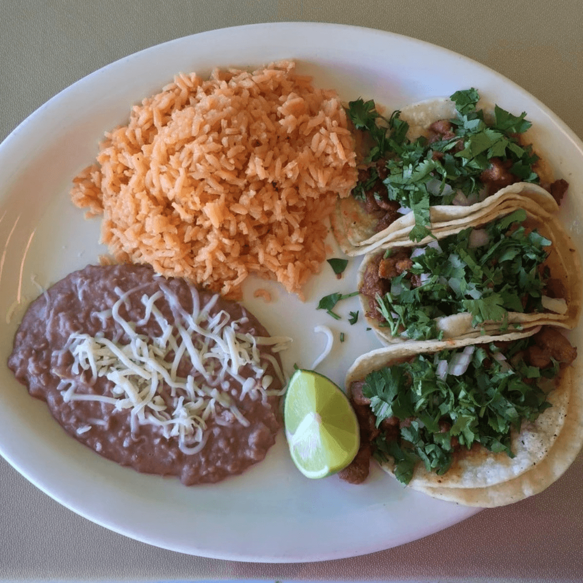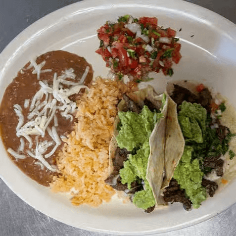 3 corn tortillas filled with your choice of meat, onion & cilantro served with rice & beans, vegetarian option