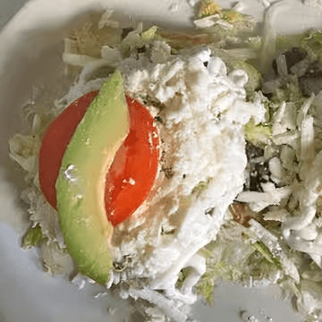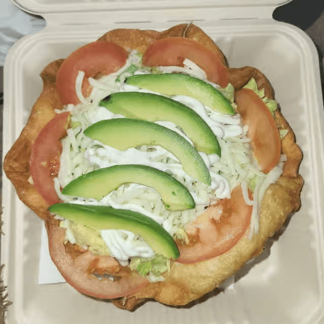 2 homemade fried tortillas, topped with beans, choice of meat, lettuce, avocado, crema and queso fresco