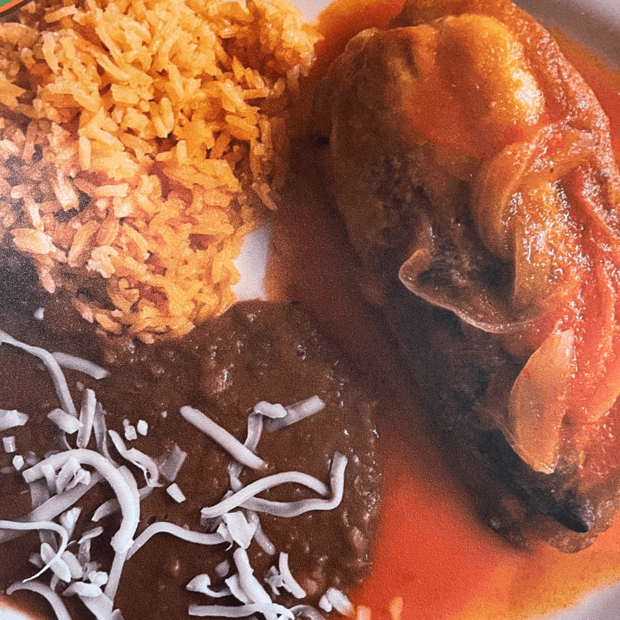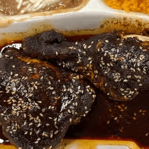 Chicken in an oaxacan mole with rice & beans served with homemade tortillas