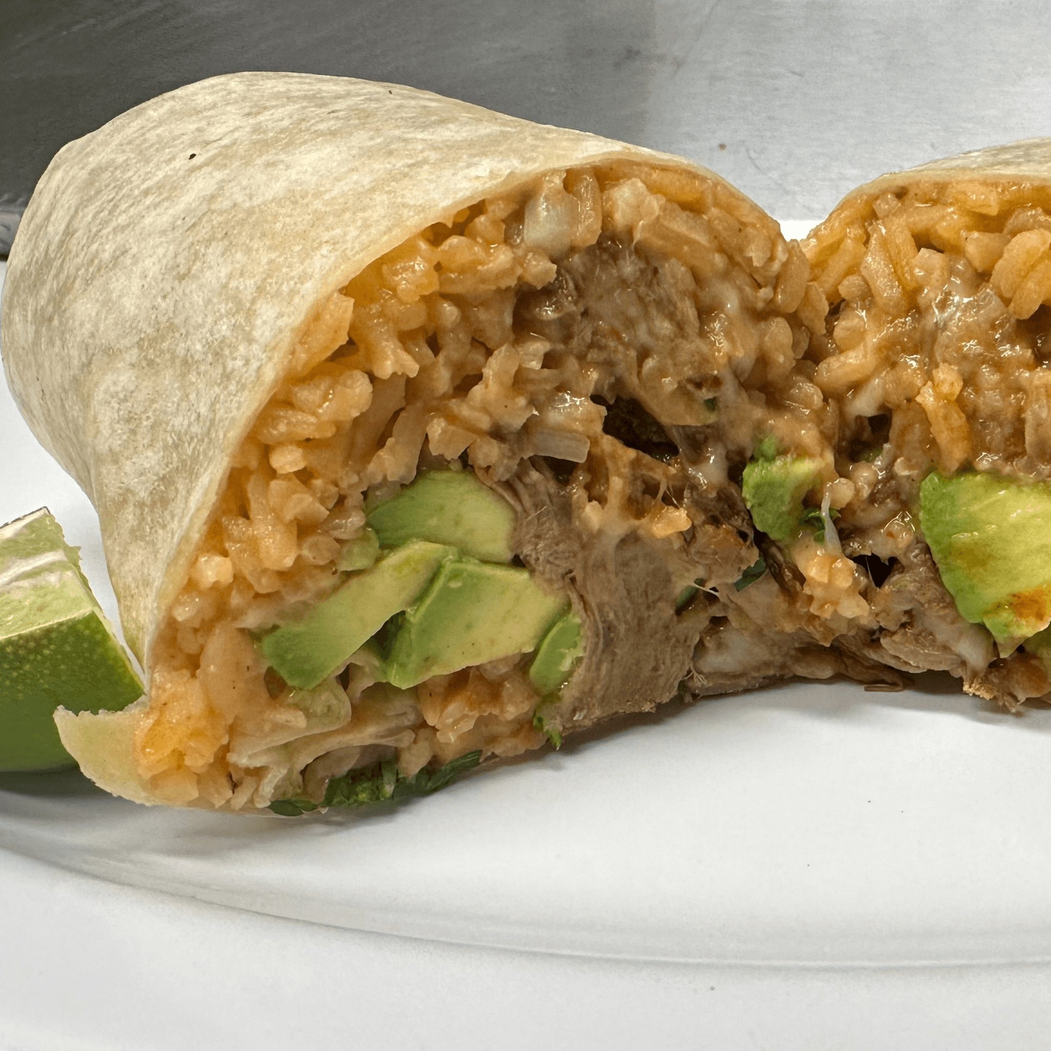 12' flour tortilla Rice,beans, birria, onions,cilantro,cheese and avocado