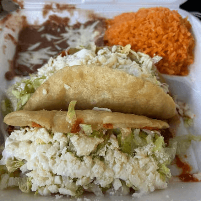 2 homemade puffy tacos with shredded chicken, lettuce, crema and queso fresco rice & beans, substitute any meat or vegetarian option