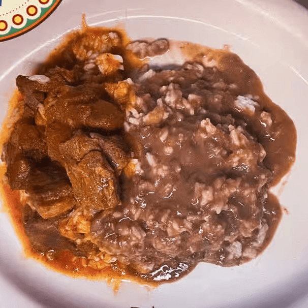 Pork with salsa roja with white rice & beans served with choice of flour or corn tortillas