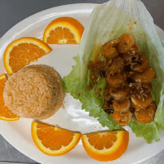 Garlic shrimp served with a side of rice